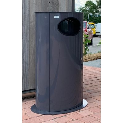 Litter bin with elliptic shape made up of a steel sheet. The container has an hole for the introduction of waste in an openable door on the head part withthe lock. The cover is welded to the body of the container and is holed in the middle for the introduction of the removable ashtray. The litter bin is complete of the ring-holder for the sack. The litter bin is supplied with a base plate dim.630x430 for the surface fixing on the ground with bolts. All metal part are galvanized and powder coated in different RAL colour and all the screws are in stainless steel.