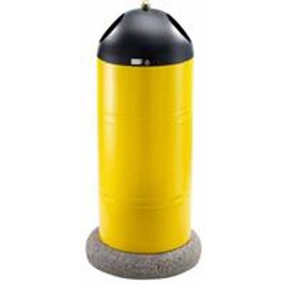 Litter bin with cylindrical shape container D.400 mm made up of steel sheet thickness 10/10 with 2 rings as a reinforce in the upper and the bottom part in order to grant the stability of the container. The cover in hemispherical shape with 2 holes for the waste throw, is fixed at the container by a strong hinge that permit to open the cover turning it from the top. The cover is closed by a lock with universal key. The container is complete inside of a ring in steel tube to put the sack for the wastes. On the bottom part the litter bin is fixed at a concrete base D.500 mm that give the item the stability when is laid at the ground. In alternative the base can be in steel and fixed at the ground with the bolts. All metal parts are galvanized and polyester powder coated in different RAL colours and all the screws are in stainless steel.