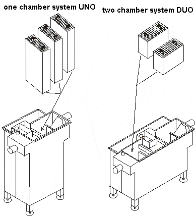 In the LK high-grade steel separator SYSTEM H there are inserted particularly arranged weirs, dipping walls and flowreducing chambers, in order to increase the efficiency. Thus a very small size is reached. The patented LK high-grade steel separator for light liquids "SYSTEM H" is certified and examined according to DIN 1999, examined of the LGA Bavaria. It shows a new way for the separation of organic hydrocarbons and oils from water.