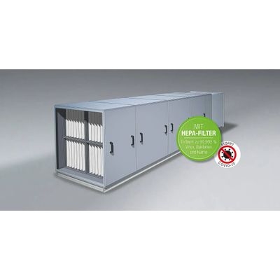 A highly efficient EC fan sucks in the hall air with high air output and returns it to the hall in a cleaned state. The first filter stage uses a coarse filter of filter class ISO Coarse and filters out the corresponding coarse particles. In a second filter stage, the air is cleaned using a fine filter of filter class ISO ePM2.5.