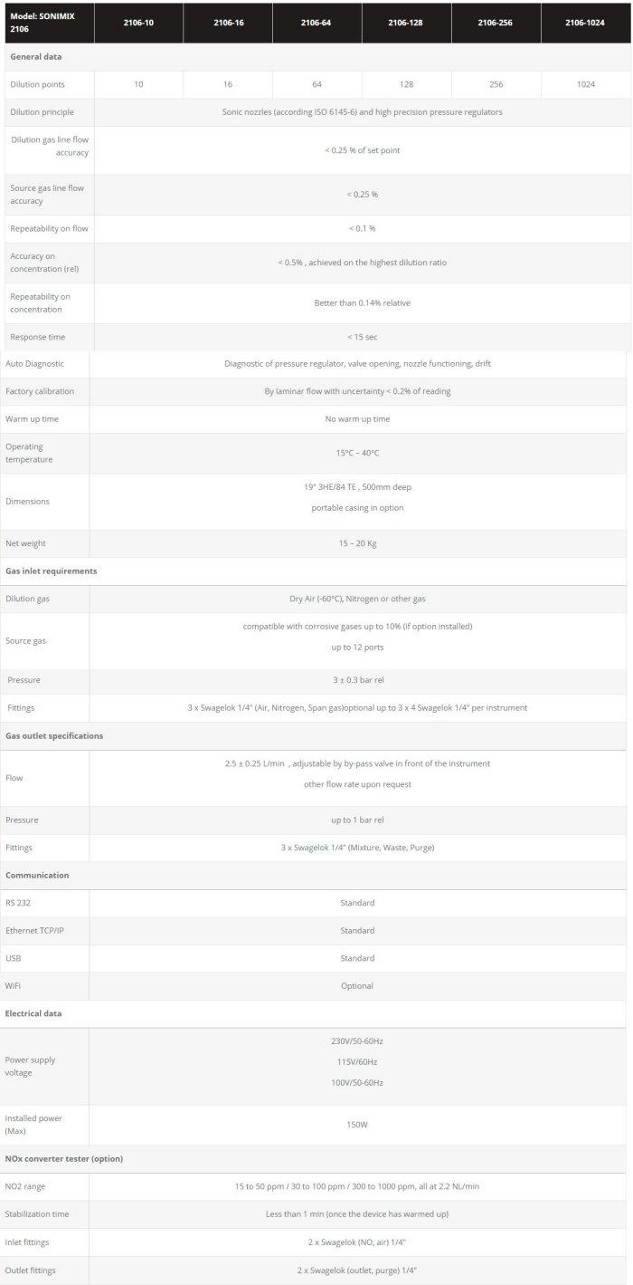 The Sonimix 2106 is a gas mixer mainly used to calibrate and linearize gas monitors and to generate specific gas mixtures. The Sonimix 2106 is based on the principle of gas flow through sonic nozzles and is built according the ISO 6145/6 standard. The sonic nozzle principle makes it the most accurate and stable device on the market. It generates binary mixtures from 0 to 100% in fixed steps in a pure mechanical process without electronic regulation and without any influence from ambient pressure or temperature.