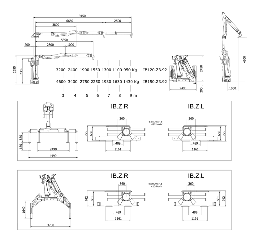 Net load moment: 96 KNm: 138 KNm. Net rotation torque: 28 KNm: 30 KNm. Rotation angle: 425˚: 425˚. Maximum reach: 9.20 m: 9.20 m. Operating pressure: 240 Bar: 240 Bar. Recommended pump flow rate: 1x90 Lt/min, 2x70 Lt/min: 1x100 Lt/min, 2x80 Lt/min. Loader\Crane weight (excluding terminal equipment): 2700 kg: 2800 kg.
