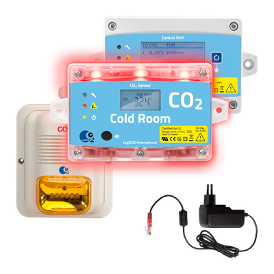 Cold Room CO2 Sensor + Central Unit Mk9 + Horn/Strobe LED incl. cable + 10 m power/ communication cable + power supply incl. cable + plug lock + 5m signalization cable + 1 J45 1-1 connector + 1 RJ45 1-2 connector + manual + Central Unit sign+ H/S sign and collar seals.
