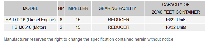 Driven by diesel engine especially suitable for area without electric support. With more impellers to improve pond water circulation and best oxygen. Less power consumption and less investment cost. Easy maintenance and energy saving. HS-D1216/HS- M1216 provide about 76.5kgs O2/Hr. Active horizontal water current about 70M. Active vertical water current about 1.6M to 2.5M. Flutter deep about 100-110mm.