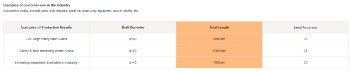 We are one of the largest manufacturers in Japan of long ball screws longer than 6 meters. Our products are highly valued by machine manufacturers internationally. We meet the rigorous demands for high accuracy. Long ball screws are utilized in machine tools and other applications that require large workpieces.