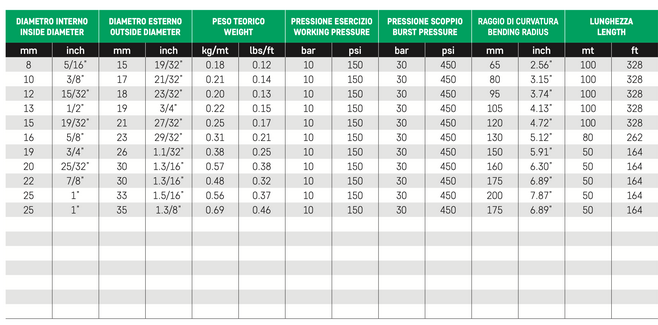 - Surface: smooth extruded Marking: ink H.T. - AIR/WATER - W.P. 10 BAR (150 PSI) - ISO 1307