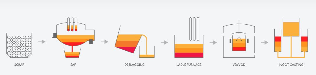 SIJ Metal Ravne produces steel by recycling scrap in an electric arc furnace, casting it into ingots, and rolling or forging it into high-quality long steel products. Their own forging shop, rolling mill, ESR remelting furnaces, and a wide range of heat treatment and machining options allow them to produce a diverse array of more than 200 steel grades in different dimensions and forms.