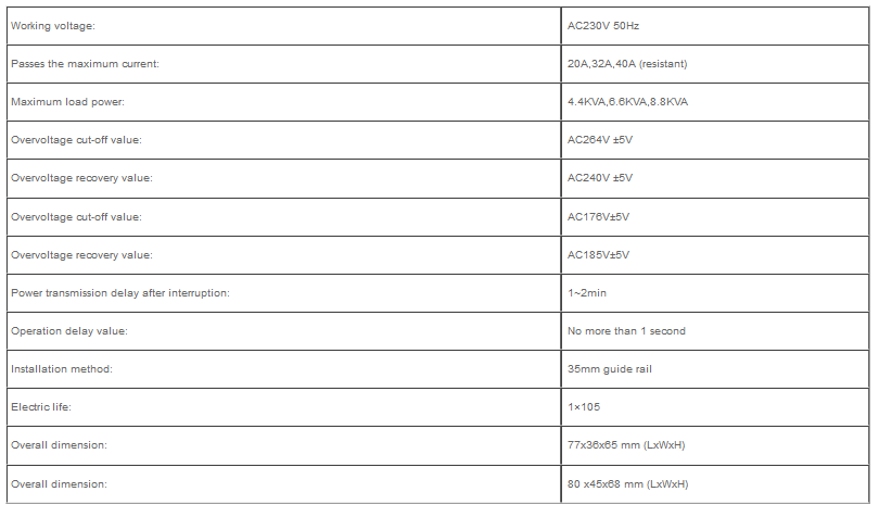 It can rapidly and reliably cut off the load power to protect the appliance and human safety when the electric voltage is more than or lower than operating value of protector. The protector can automatically make the power to recover the power supply after the voltage recovers to normal, which achieves fully automatic control. The double color LEDon the panel indicatesprotective device work status, the lamp is green for normal power supply, protection function start to cut off the power when it turns to red. It has simple and convenient, stable and reliable performancethe characteristics. The product has compact structure and good appearance, and is installed in rail with D247 (C45) system.