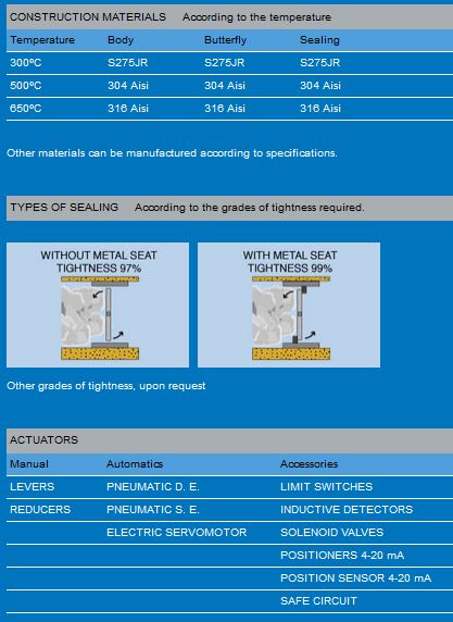 Louvers damper type DL for assembly between flanges. Fabricated construction. Standard design planned for assembly of the actuator shaft be in horizontal position. According to working temperature different kind of materials are used. Design dimensions planned for external installation of heat-resistant. Optional design for louvers in PARALLEL and OPPOSITE side. Relative tightness and different types of sealing according to the grade of tightness required for the application. Limit temperature: 500º C, limit pressure: 0.5 bar. Top speed: 25 m./sec.