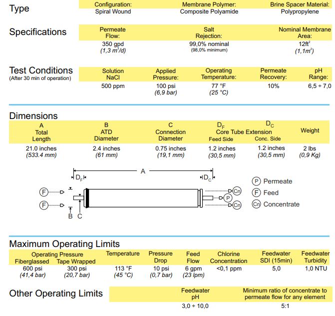 Model Type: LOW4-2521. Nominal Salt Rejection, %: 99,0%. Permeate Flow, GPD: 350. Test *: A. Extra Low Energy, Excellent Productivity - Brackish Water Element.