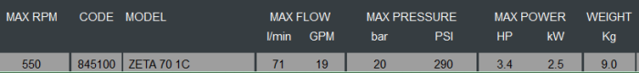 MAX FLOW (l/min): from 71 to 71 . MAX PRESSURE (bar): 20 . MAX RPM: 550.