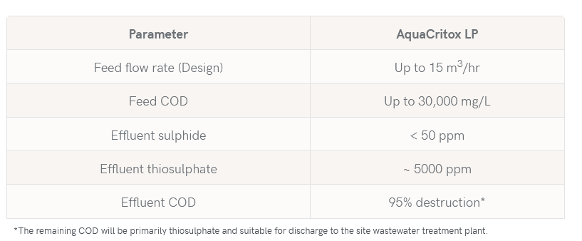 The treated effluent from the AquaCritox® LP will contain some level of thiosulphate suitable for discharge to a downstream wastewater treatment facility. The table below indicates expected effluent quality relating to a sulphidic spent caustic stream.