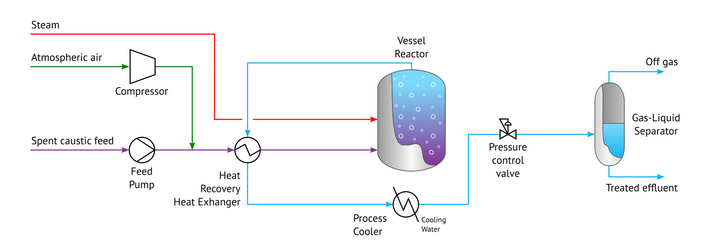 The AquaCritox LP is a low-pressure hydrothermal oxidation (Wet Air Oxidation) solution specifically aimed at treating purely sulphidic spent caustic streams. The multi-step hydrothermal oxidation process uses air as the oxidant and operates at pressures up to 5 barg and temperatures up to 160°C.