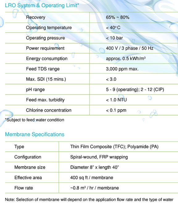 Low Pressure RO membranAlles (8040) cartridge skid mounted. Electrical control panel and D.O.L/ Frequency-Controller. Feed and High Pressure pumps . Guard filter. Pressure gauges, flow meters and manual valves . PVC and / or S/S piping. Permeate TDS meter. U740 Ultra-Filtration membranes skid mounted (optional). CIP system (optional).