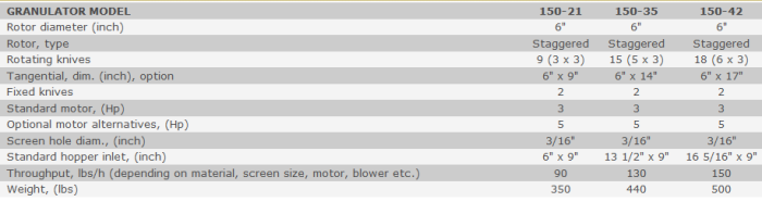 The Rapid 150 Series of low speed granulators is intended primarily for beside-the-press injection molding applications. Immediate in-line recycling of sprues and rejects maintains product quality and eliminates the distribution and storage of waste and regrind. No matter how your production machines are configured, we have the right beside-the-press or under-the-press models for your kind of production.