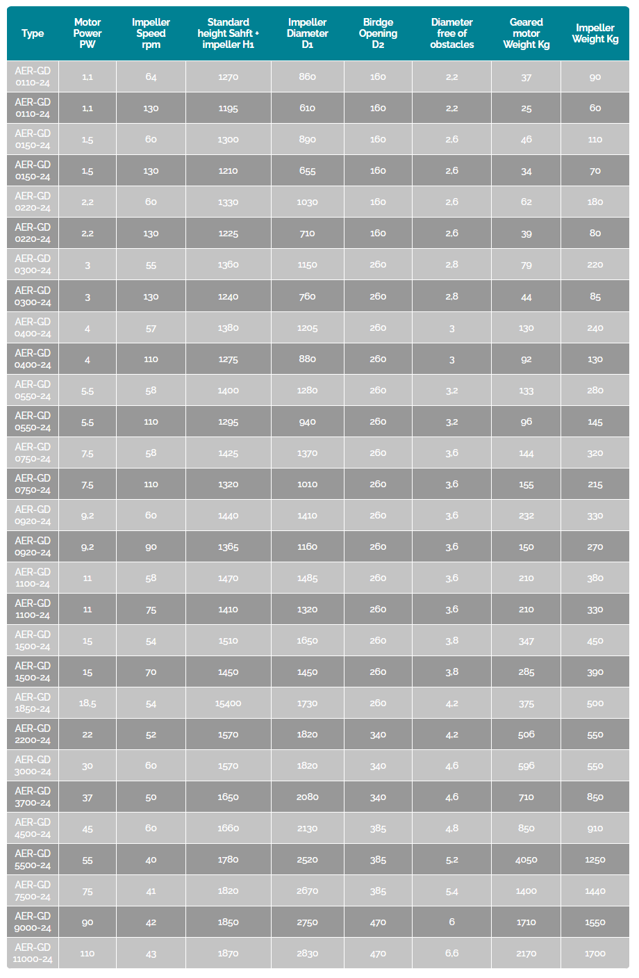 - Four impeller options – 4-blade, to produce circulation in oxidation ditches, and 6-blade, for higher efficiency: LH or RH.