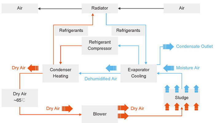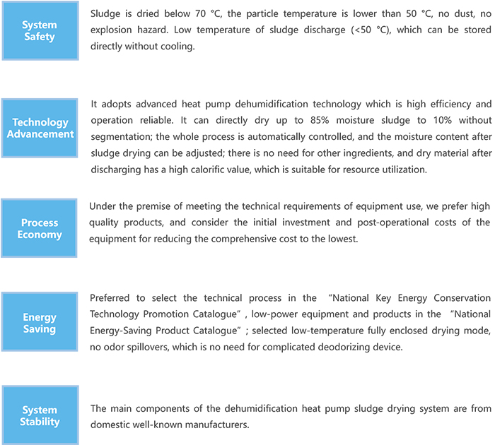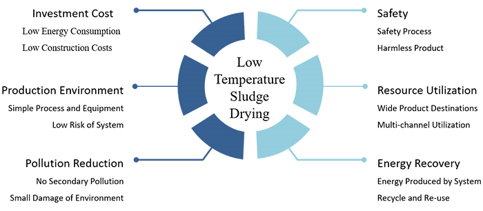 Low temperature sludge drying technology is injecting circulating, warm and dry air to evaporate and take away the moisture in the sludge cake produced by sludge dewatering equipment such as multi plate screw press, plate and frame filter press, super high pressure filter press and so on to achieve the purpose of sludge weight reduction. It is suitable for Municipal sludge and Industrial sludge such as pickling sludge, electroplating sludge, steelmaking ironmaking sludge, alumina sludge (red mud), oily sludge from oil fields and refineries, chemical and pharmaceutical sludge, papermaking sludge, printing and dyeing sludge and leather sludge, sludge weight reduction capacity of more than 70%, thereby greatly reducing enterprise production costs.