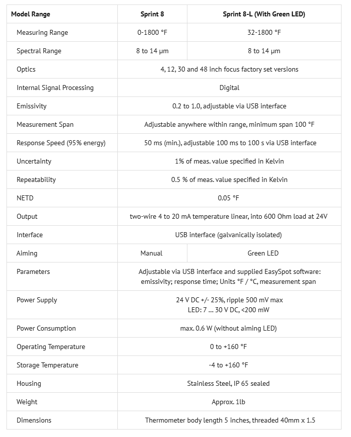 Available in eight models offering different focus and optics options, Sprint 8 is ideal for monitoring temperatures spanning -18 °C (0 °F) to 982 °C (1800 °F) in applications in the industrial processing and minerals industries.