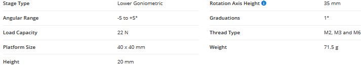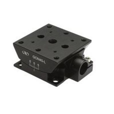 Goniometric Stage, Lower, ±5°, 40 x 40 x 20 mm, M3 & M6. The M-GON40-L Lower Metric Goniometric Stage rotates an object about an axis, which is unobstructed by the stage itself, located over the center of the top platform. GON Series Goniometric Rotation Stages use an actuator-driven precision dovetail slide and are spring-loaded to reduce the backlash commonly found in similar worm-gear driven stages.