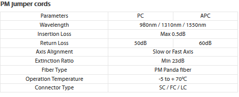 Polarization maintaining (PM) patch cord / jumper leads are built with polarization maintaining panda fiber and connectorised using FC/UPC, FC/APC, SC/UPC, SC/APC and LC connectors. FC connectors can be supplied with wide key (2.14mm, N type) or narrow key (2.02mm, R key) width. Patchcords can be supplied in 250? bare fiber, 900? buffered fiber or 3mm cable.