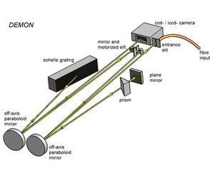 The DEMON is a spectral high-resolution Double Echelle MONochromator. It consists of an optomechanically motorized and thermally robust echelle spectrometer in sequence with a prism monochromator that is used for the selection of the inspection range. The patented optical design of prism and echelle grating is arranged in Littrow configuration and benefits from the high image quality of the applied parabolic mirror optics. The width of the prism monochromator exit slit, which serves also as entrance slit of the echelle spectrometer, is adjustable. An active wavelength stabilization is provided by using the internal calibration lamp for highest absolute wavelength accuracy without the necessity of extensive temperature stabilization.