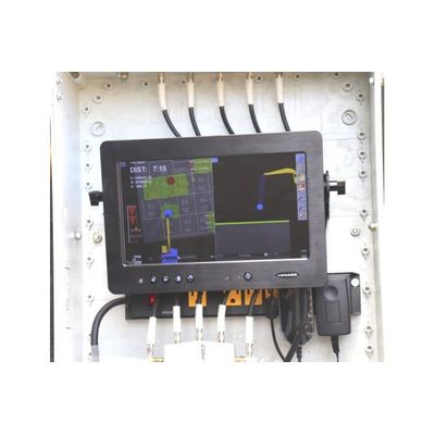 When the GPS program is loaded into the Dual Axis Blender computer the operator sees the cell layout, the cell designation, the machine and the blender head. “DIST” is the distance to the bottom mixing elevation or the target. The cross-sectional view on the right of the GPS screen shows the mixing progress toward the target. This screen is broadcast to the reagent plant operator so he has real-time information on the mixing progress, which allows him to match the rate of reagent delivery to the mixing rate of the blender. The screen in the photo is the screen on one of the reagent plants. The screen turns green when the blender is between 0.5’ above the target and the target. The screen turns yellow when mixing is between the target and 0.5’ below the target. When mixing is deeper than 0.5’ below the target, the screen turns red.