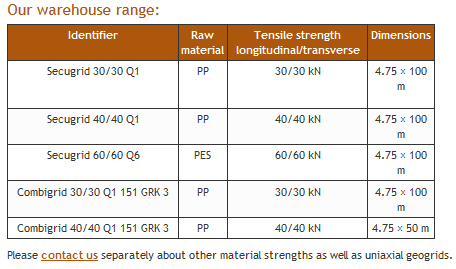 We stock Secugrid polyester (PES) and polypropylene (PP) geogrids. These grids are characterised by high power absorption with low elongation (no constructional elongation), immediate force connection and interlocking with the fill soil, limited creep properties, continuous homogenous molecular structure, high friction angle because of the structured surface of the bars as well as robustness against installation damage.