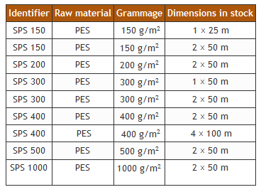 Material: mechanically-strengthened nonwovens made from fibre blends (PES), white or coloured. Production: from 100-2,000 g/m2 grammage and dimensions from 1-6.50 m width and variable roll lengths