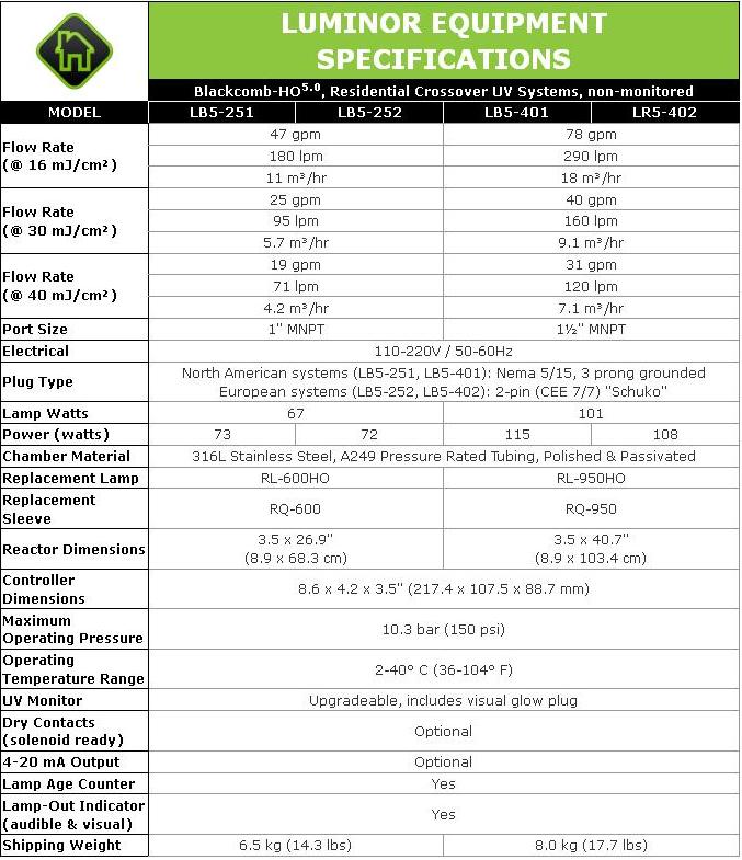 LUMINOR - Model BLACKCOMB-HO 5.0 -Residential UV Water Disinfection