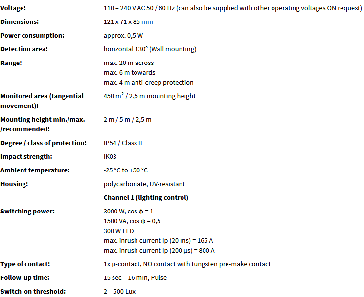 Motion detector with 130° detection area and anti-creep zone.