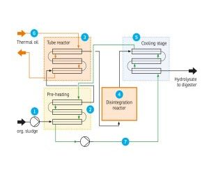 • The pre-heating takes place in the first stage of the heat exchanger system (2), then the sludge is heated to disintegration temperature in the tube reactor (3).