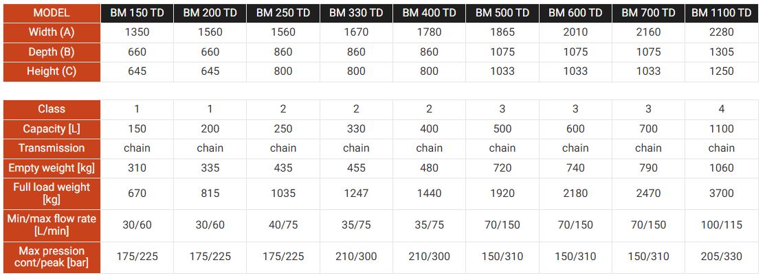 The concrete mixer bucket M3 model TD is equipped with: safety grill with bag splitter, BOTTOM and bolted HELIX made of wear resistant steel 450 HBW, hydraulic motor fully protected, chain tensioner, electric valve with hydraulic hoses, electric connection kit, hydraulic hoses, flat face couplings (only for SSL), hydraulic opening of the bottom through a cylinder with covered rod, manually-operated side discharge, unloading pipe L=1500 mm, side chute extension, coupling to the machine (standard bolted bracket starting from mod. BM500TD).
