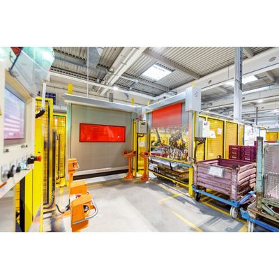 Due to its space-saving and compact design, the EFA-SRT® MS high-speed roll-up door satisfies all requirements for optimum integration into the required safety guard. The standard door leaf is fully transparent and equipped with warning strips as a standard. Coloured, highly tear-resistant and transversely stable curtains as well as welding protection curtains are also readily available. All curtain versions are, of course, free of substances which are detrimental to paint adhesion.