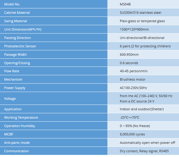 MS04B is an ultra slim optical swing gate combining security and comfort in a minimalist design. It is a terrific solution for entrance points of banks, administrative buildings, business centers and other sites with requirements for design and safety.