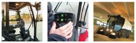 - Far Left: Cab comfort and panoramic view makes sweeping easy and safe.