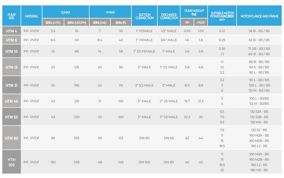 Mag drive centrifugal pumps series HTM PP/PVDF are made of thermoplastic materials (Polypropylene and PVDF) and are suitable for high corrosive liquids. Thanks to the innovative mag drive system, pumps model HTM PP/PVDF reduce the risks of losses and the maintenance costs. The transmission of the motion occurs through magnetic joints without using mechanical seals. This guarantees the maximum safety and efficiency. The pumped liquid has to be clean and without solids in suspension.