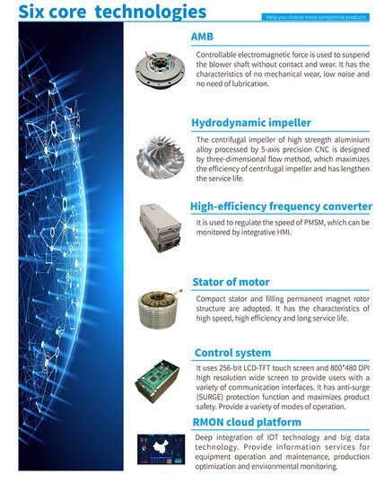 The maglev turbo blower produced by Tianrui Heavy Industry is a high-tech green energy-saving environmental product. Advanced magnetic bearing, three-dimensional impeller, highspeed permanent magnet synchronous motor, high-speed frequency converter, intelligent monitoring and control technology are adopted. When being started, it is suspended at first and then rotated, without friction and lubrication, direct connection between turbine and rotor,and zero transmission loss. Compared with Roots blower, it can save 30°/o-40°/o energy and reduce noise to less than 80 dB. It is widely used in sewage treatment, aquaculture, steel, cement, food.brewing, textile, petrochemical, thermoelectric and other fields.