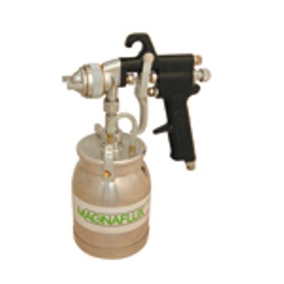 Manual spray gun that delivers a light, even dry developer coating. Uses shop compressed air (dry). Features mix, jet and spread controls. 1.1 litre capacity.