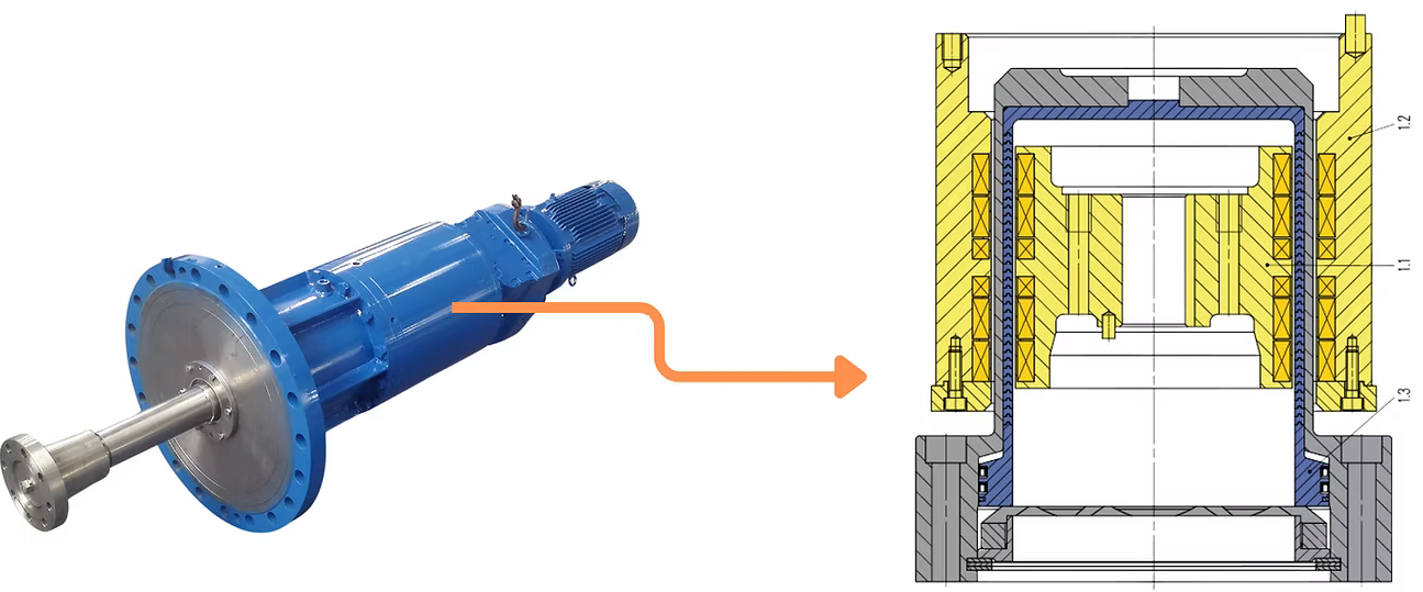 Sunkaier magnetic mixer consists of weld plate and a mixer unit including gear drive. The static male bearing is secured to the vessel`s tank plate and the ratating female bearing is integrated and sealed into the mixing head, or rotor, of the mixer.