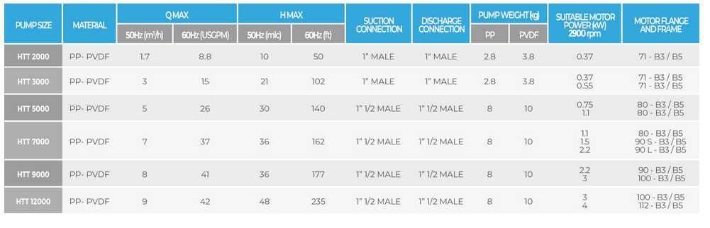 Mag drive regenerative turbine pumps series HTT are made of thermoplastic materials (polypropylene-PP and PVDF) and are suitable for pumping high corrosive liquids. Thanks to the innovative mag drive system, pumps model HTT reduce risks of leakage and emissions and the maintenance costs. The transmission of the motion occurs through magnetic joints without any mechanical seal. This sealless design guarantees the maximum safety and efficiency. The pumped liquid has to be clean and without solids in suspension.