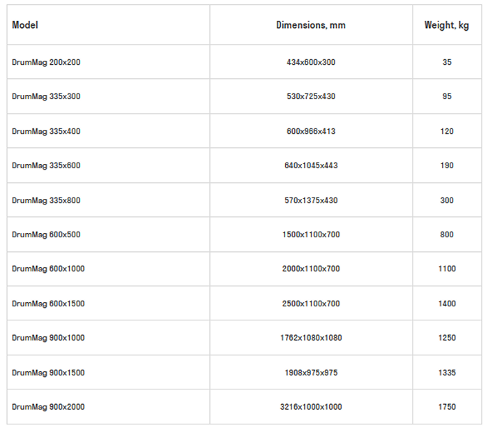 • from 0.08 to 0.24 T (from 800 to 2 400 Gauss) for obtaining a saleable product from slag dumps; processing of ferrous scrap up to 150 mm; cleaning raw materials from hardware, tramp metal or shredded tires from the cord. DrumMag protects crusher and shredder from damage and premature wear.