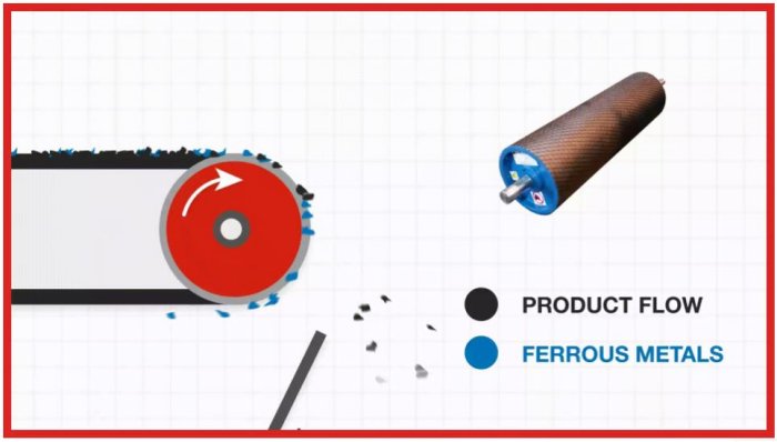 - Removing ferrous metal contamination from conveyed grain and dry granular food;