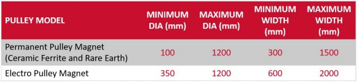 Magnetic Head Pulleys are available in a wide range of diameters and widths to suit a wide variety of applications and installation requirements. The magnetic field is either produced using a permanent magnet or an electromagnetic coil.