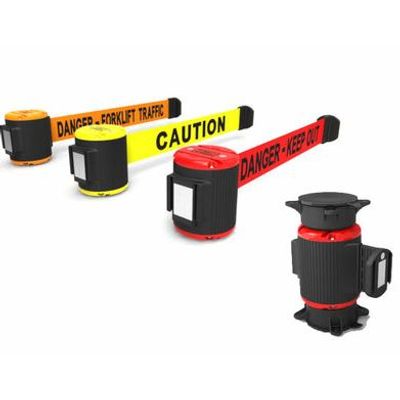 Magnetic Retractable Safety Barrier, 30` Security Tape. The Banner Stakes Safety Barrier 30` Magnetic Wall Mount Barrier provides up to 30 feet of safety barricade to block off hallways and out-of-bounds areas. Retractable belt barrier attaches to either magnetic & non-magnetic surfaces for quick closure of docking doors, elevators, escalators, bathrooms, aisles, corridors, lock out/tag out, Arc Flash Boundary, etc. Switch from internal magnet to suction cups as needed to close off specific areas. Ideal for hazard alerts, crowd control and pedestrian safety. Designed to be surface mounted for use when floor space is limited: easily attaches to metal, stainless steel, glass, wood and plastic.