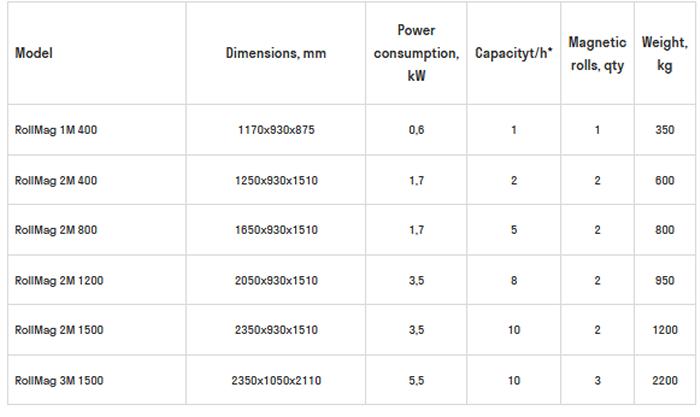 Series-produced models of RollMag separators are given in the table. It is recommended to use DrumMag M series drum magnetic separators to remove strongly magnetic component of the material before it is fed to roll separators of SMVI-1, -2, -3 series. Customized solutions can be designed according to the order requirements.