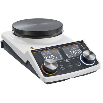 Well-designed features for a carefree stirring and heatingThe magnetic stirrer Hei-PLATE Mix 'n' Heat Expert convinces with its intuitive handling: Thanks to respectively one display per main function (stirring and heating), you have an easily legible eye on all values and settings at any time. The handling is made via two push-and-rotary controls with LED-rings for an easy identification of the active functions. Separate timers for heating and stirring functions create flexibility and let you control your experiments better. The user-friendly menu navigation makes working with this device particularly easy.