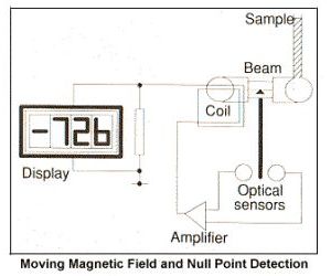 Both the Magnetic Susceptibility Balance MK1 and the Magnetic Susceptibility Balance AUTO work on the basis of a stationary sample and moving magnets. Two pairs of magnets are placed at opposite ends of a beam making a balanced system having a magnetic field at each end. Introduction of the sample into the magnetic field attempts to deflect the beam and the movement is optically detected. A compensating force is applied by introducing a current through a coil between the other pair of magnets. The current required to maintain the original postition of the balance beam is proportional to the force exerted by the sample; and the direction that the beam (magnetic field) moves indicates whether the sample is paramagnetic or diamagnetic which is shown by a plus or minus indication on the display.