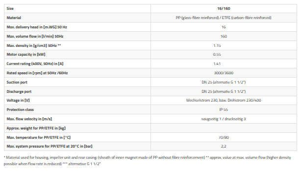 Without shaft seal. Streamlined housing made of pp or etfe. Volume flow of up to 160 l/min. Delivery head of up to 16 m.wg. Back pull-out.