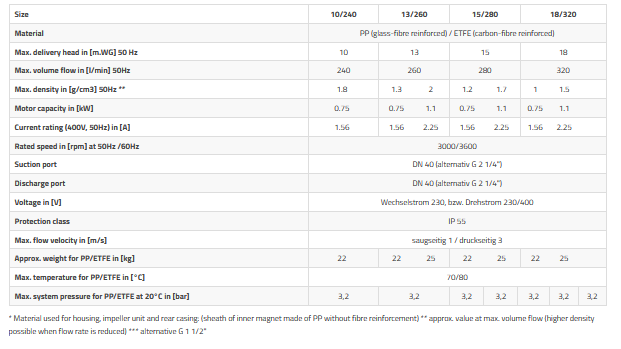 Without shaft seal. Streamlined spiral housing made of pp or etfe. Volume flow of up to 320 l/min. Delivery head of up to 18m.wg. Back pull-out.