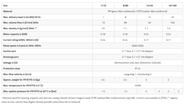 Without shaft seal. Streamlined housing made of pp or etfe. Volume flow of ma pump type 2 is up to 80 l/min, of ma pump type 3 up to 100 l/min. Discharge head of ma pump type 2 is up to 8m.wg, of ma pump type 3 up to 15m.wg. Horizontal single-stage monoblock design.